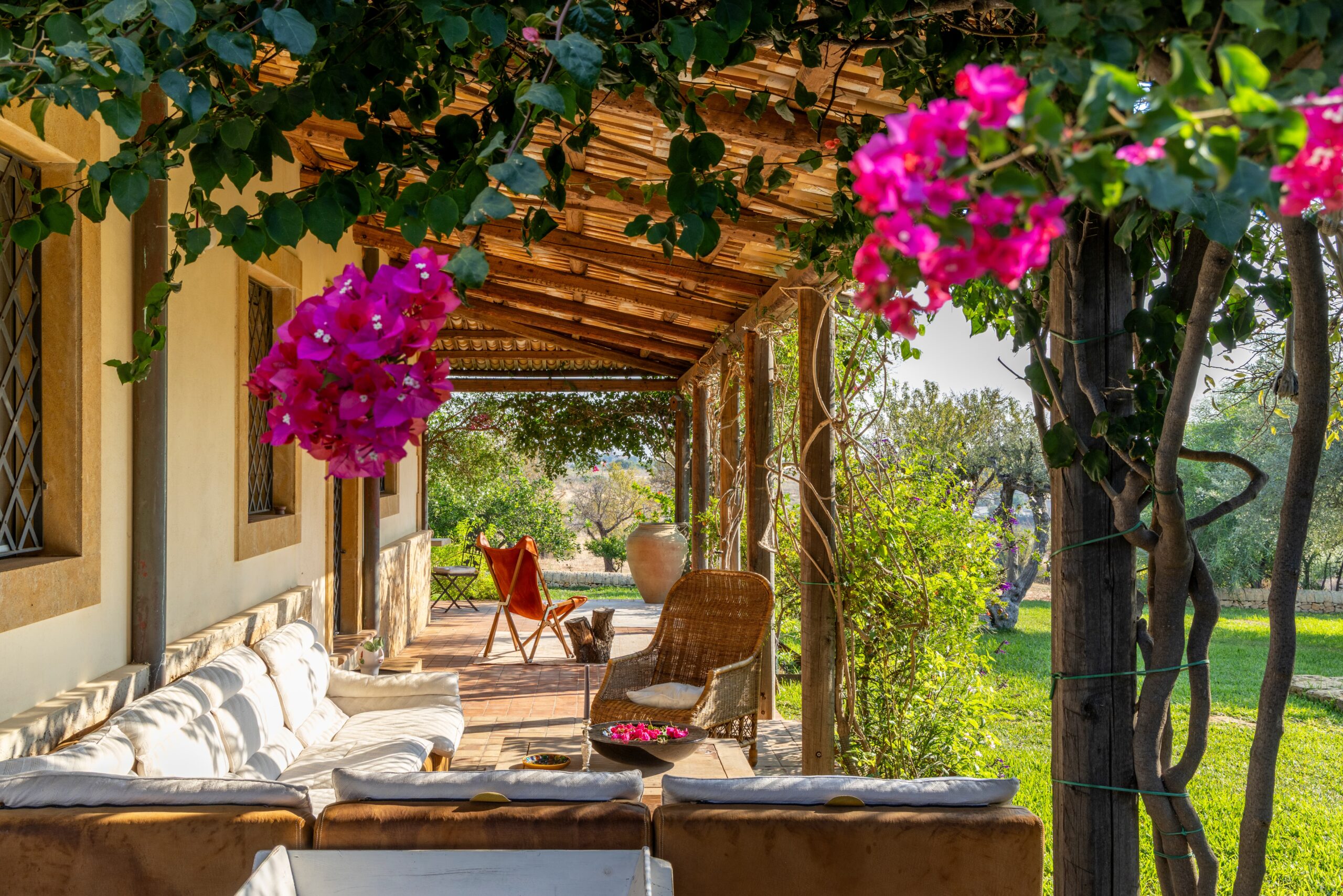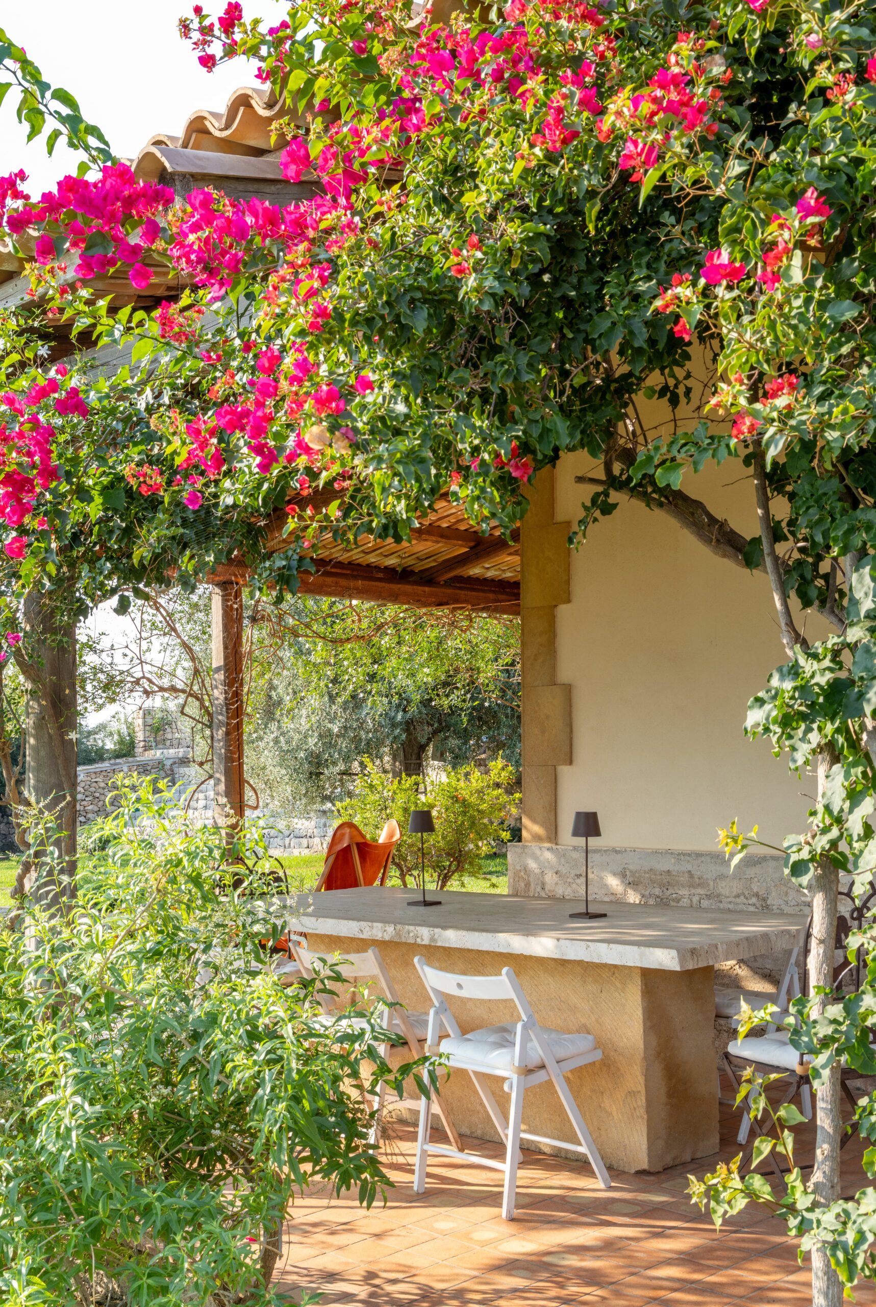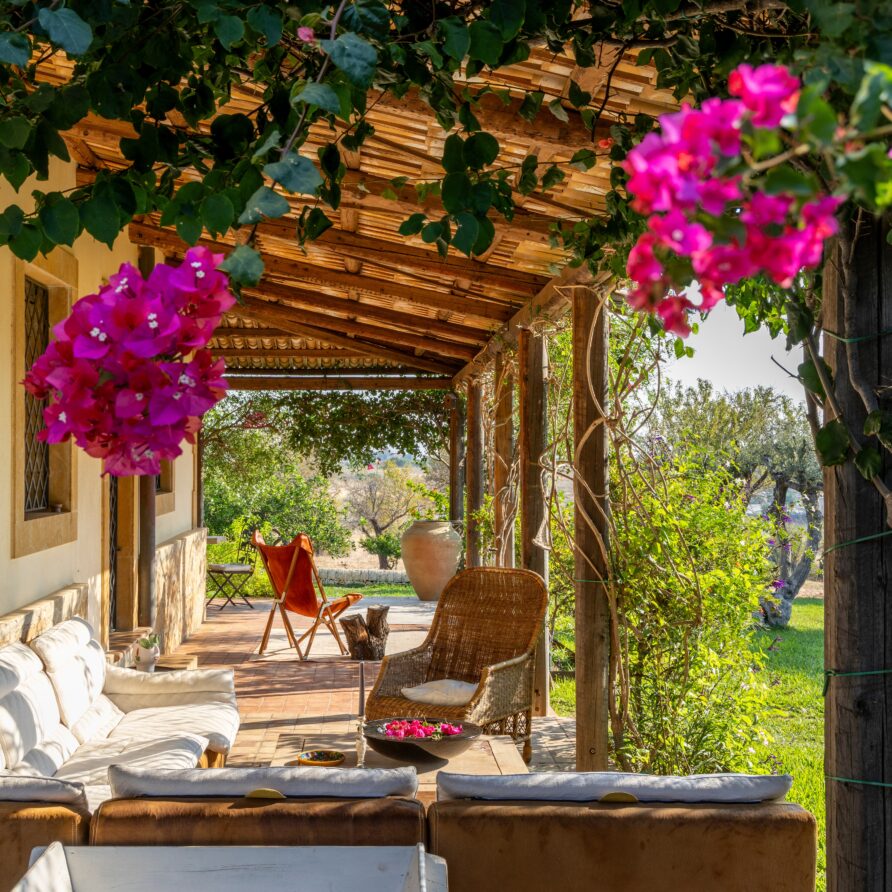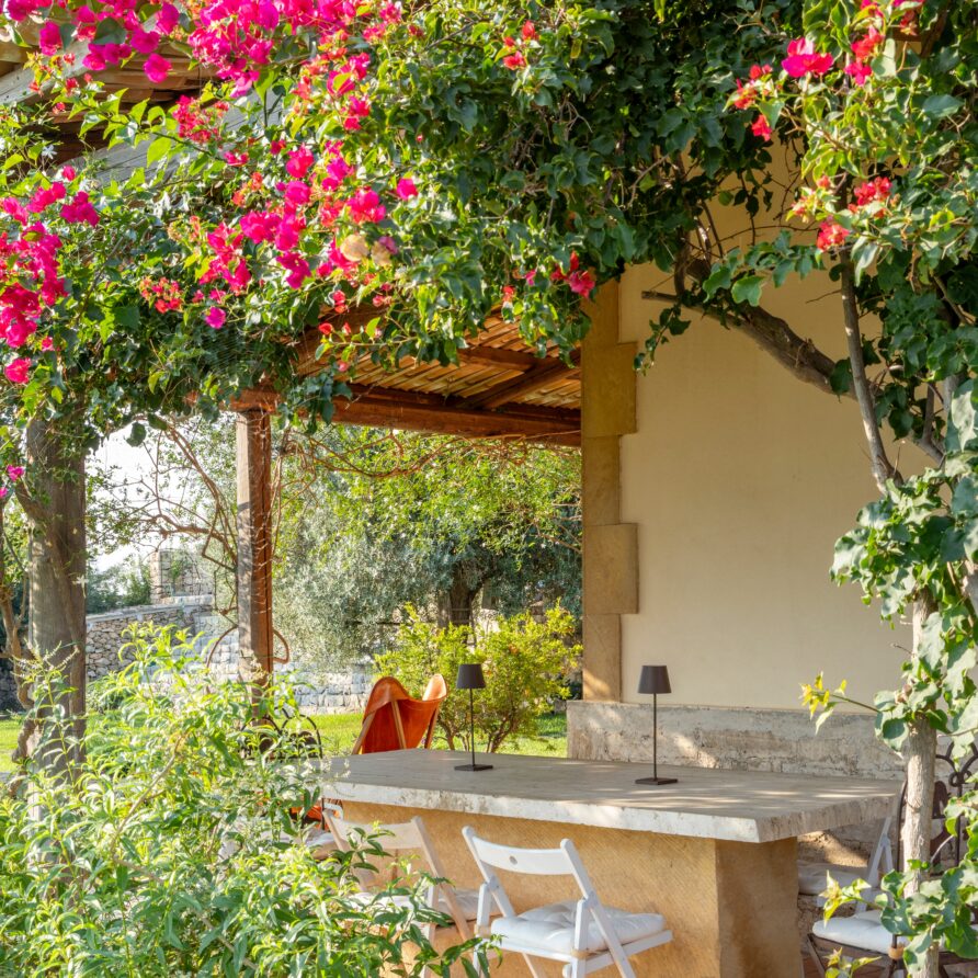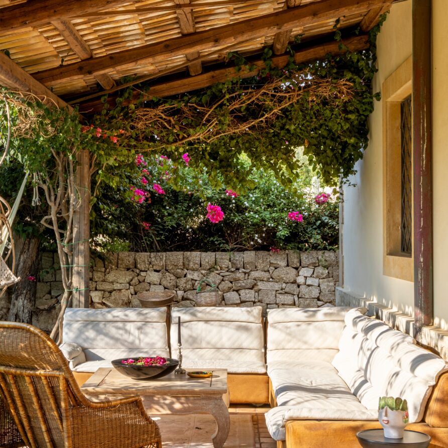 Outdoors, a wide panoramic veranda enveloped by jasmine and bougainvillea is furnished as an elegant open-air living room, featuring white sofas, rugs, and a refined stone-and-marble dining table for 12 guests.