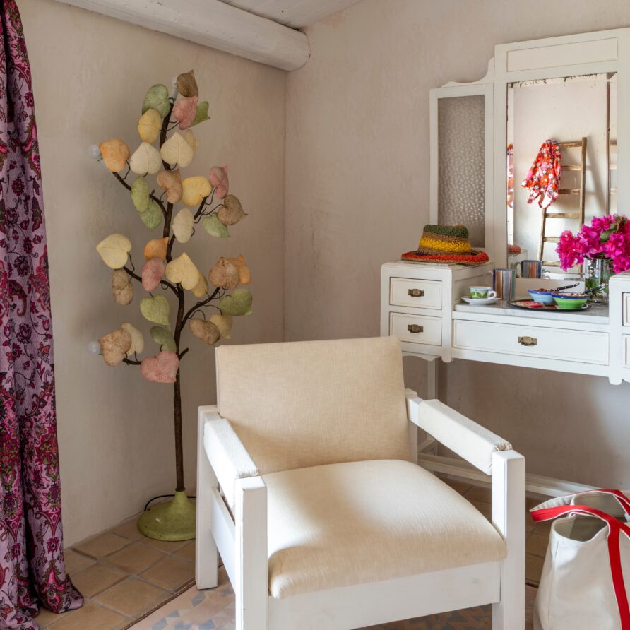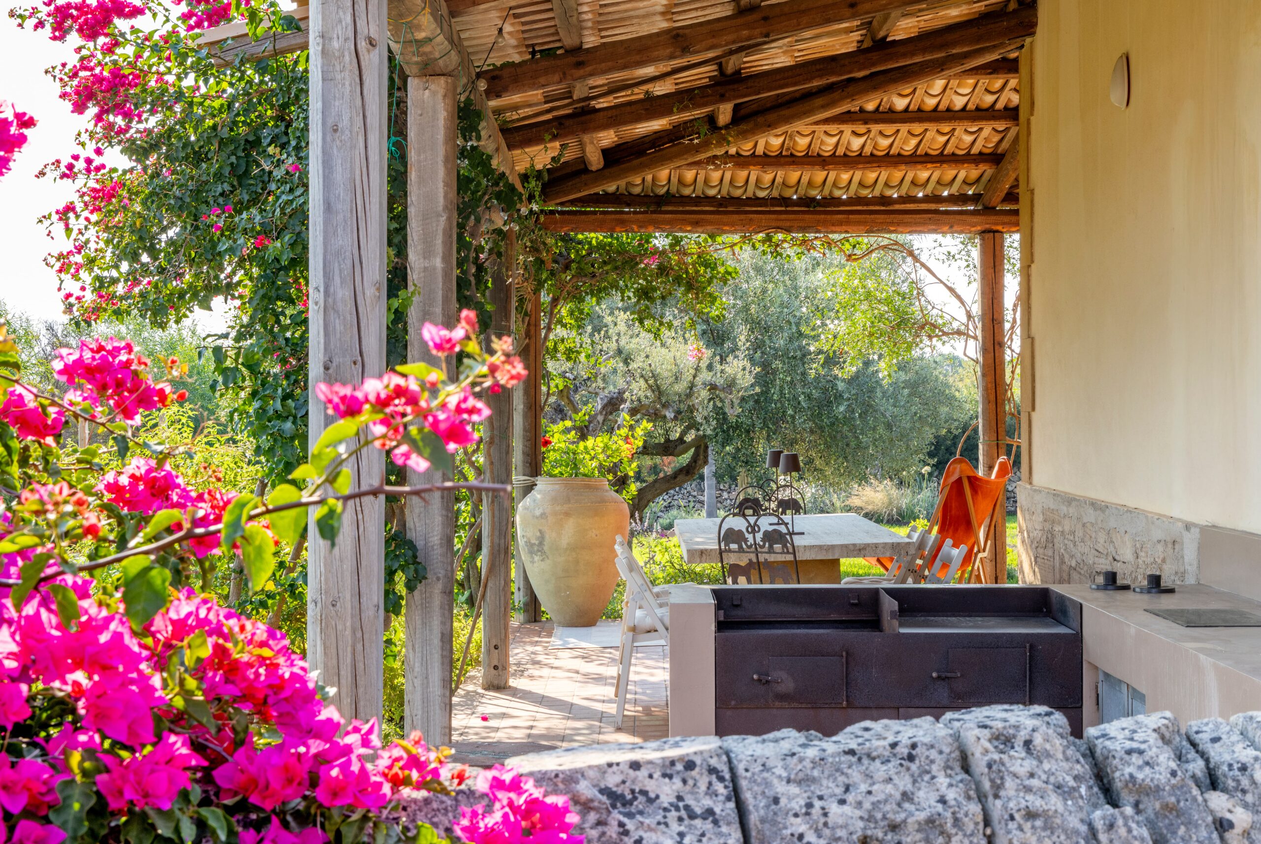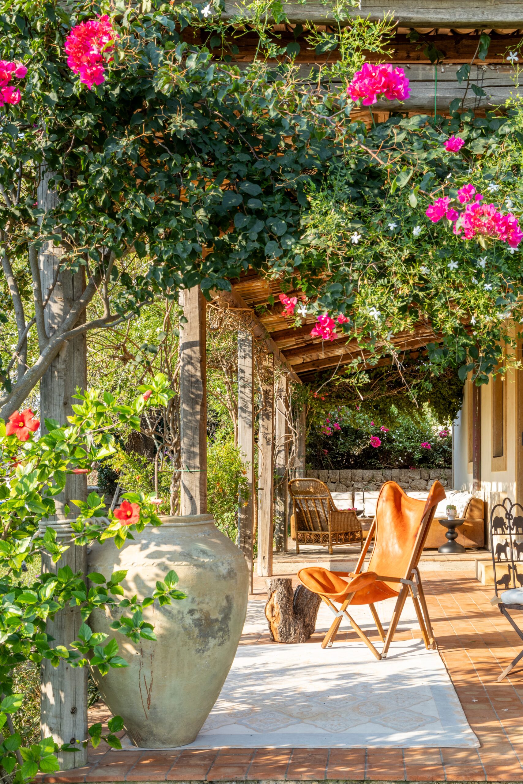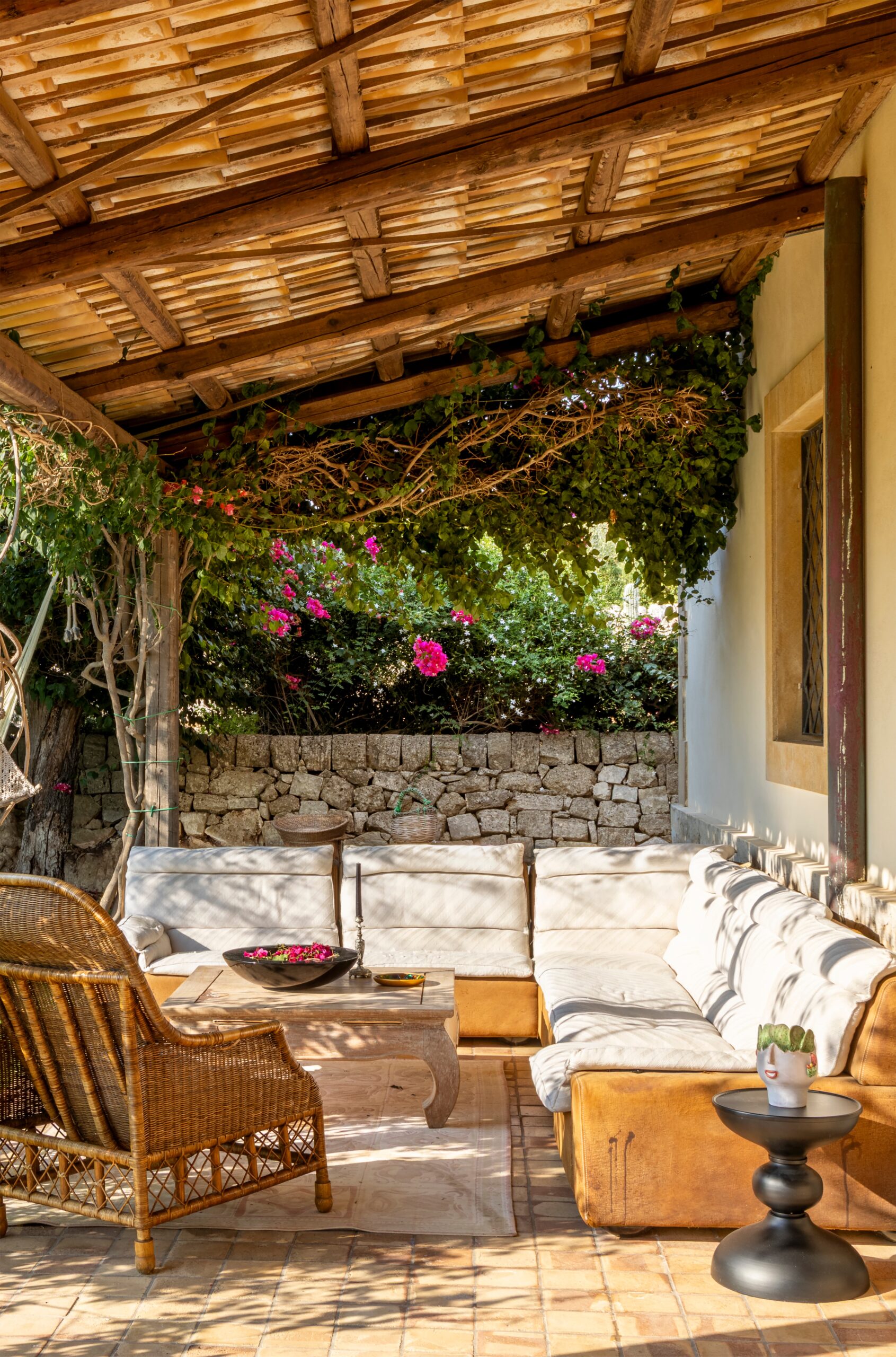 Outdoors, a wide panoramic veranda enveloped by jasmine and bougainvillea is furnished as an elegant open-air living room, featuring white sofas, rugs, and a refined stone-and-marble dining table for 12 guests.