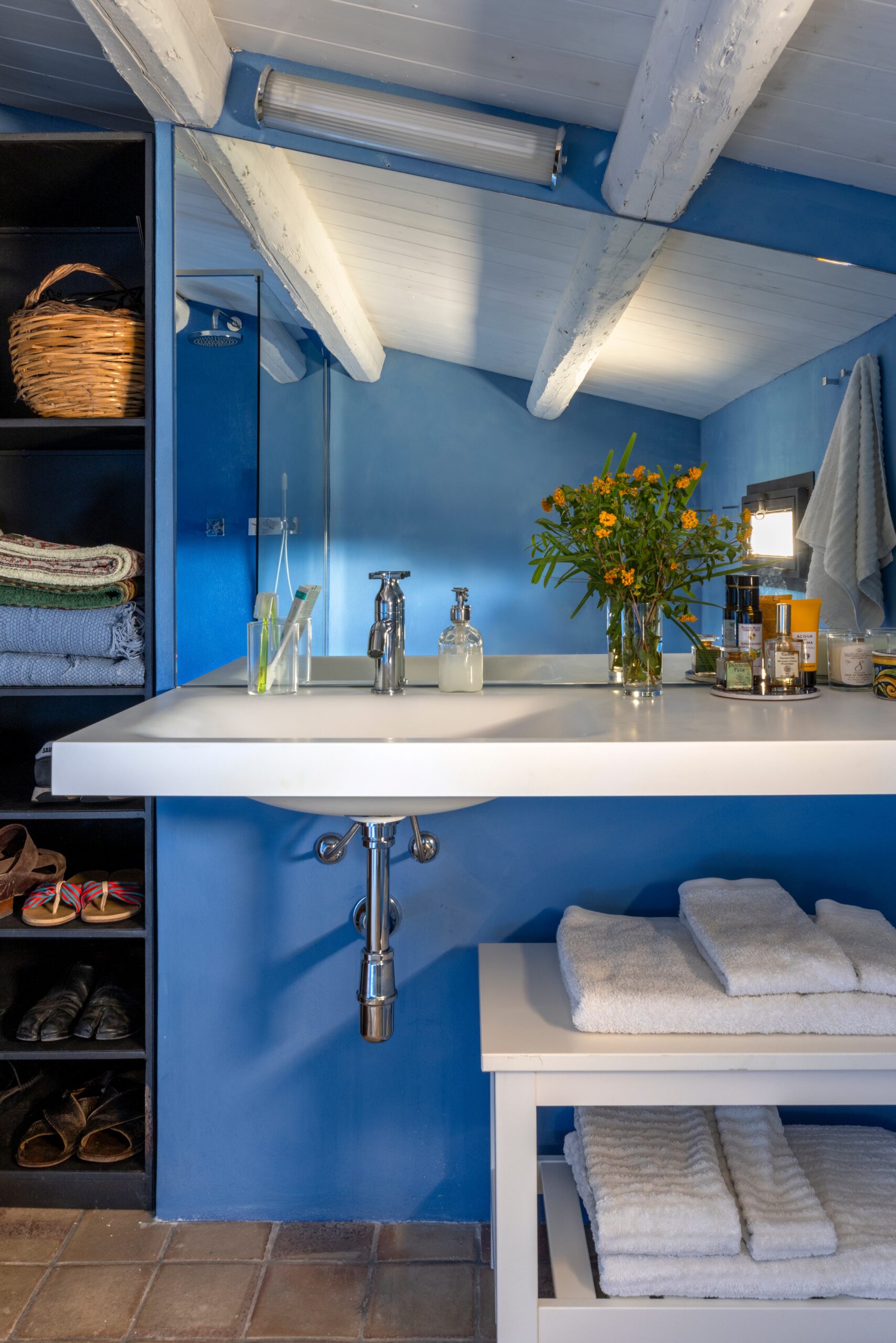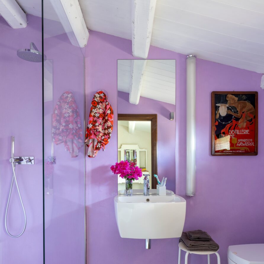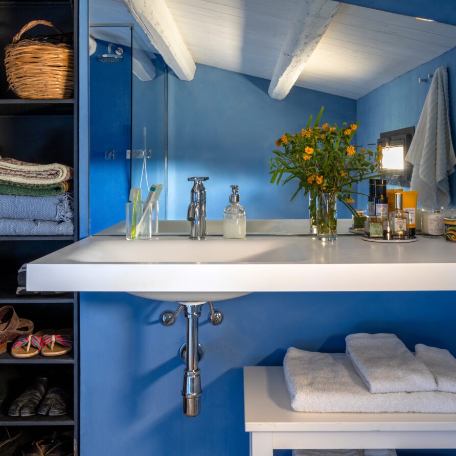Beneath the veranda, a built-in outdoor kitchen, barbecue, and open-air shower create the perfect setting for summer dinners and convivial gatherings.