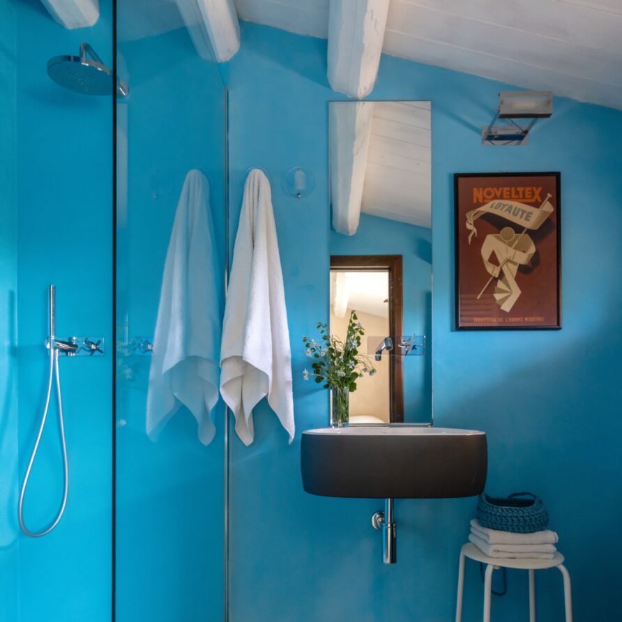 The expansive Mediterranean garden, with lawn, olive trees, and fruit trees, leads through a suggestive stone amphitheatre to the private swimming pool (11 × 2 metres). The pool area is surrounded by a dedicated sunbathing and relaxation space, complete with an additional outdoor shower.